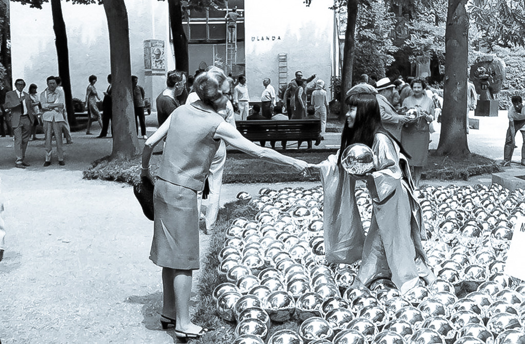 En “Infinity Mirrors”, también se exponen muestras de material audiovisual para contextualizar las piezas, y fotografías inquietantes de una performance llamada “Pieza Andante”, en la que se ve a la japonesa ataviada con un kimono rosa de flores y un parasol andando por las calles de una Nueva York, recelosa tras la Segunda Guerra Mundial.