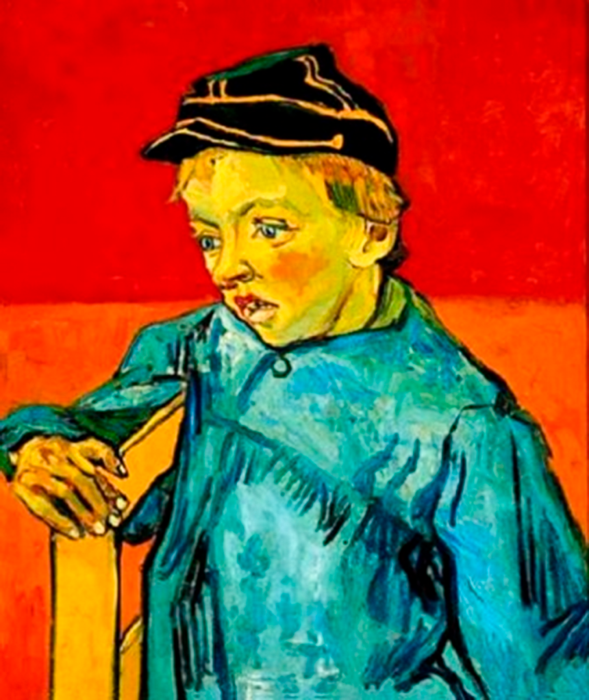 En “El escolar con gorra militar” Camille se representa sentado en una silla, el brazo derecho descansando en la parte posterior de la parte superior del objeto, la cara y el cuerpo volteados hacia la derecha. Viste una gorra marrón y una sencilla camisa azul, presentando al joven como un ciudadano de clase social baja, una persona de pueblo. El contraste de tonos fríos y cálidos, la firmeza en las líneas de contorno y la aplicación de extensas superficies cubiertas de tonos puros destacan en el cuadro, uno de los más famosos de la serie Roulin. Esta obra se puede ver en el Museo de Arte de São Paulo desde 1952. La obra es considerada la más caras de la serie por su depurada técnica.