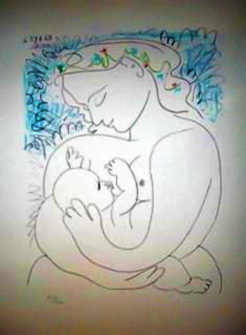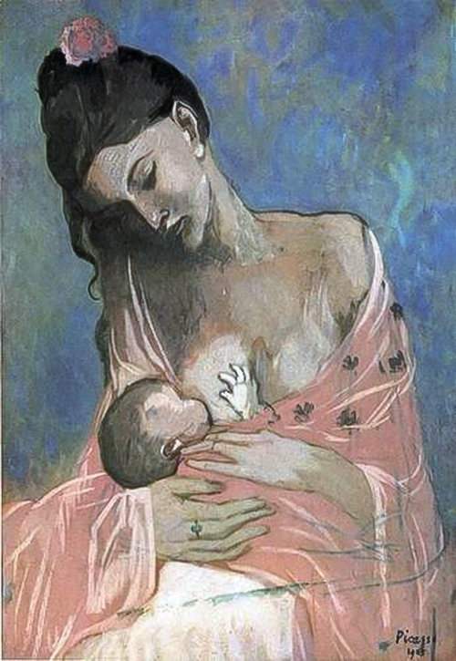 Dentro de la etapa azul de Picasso, merece especial atención “Maternidad”, de 1901, también conocido como “Madre e hijo”: una madre sentada sostiene a su hijo entre sus brazos y piernas para amamantarlo. La madre, ataviada con una bata o mantón con motivos florares, así como un clavel o rosa a modo de ornamento en su exquisito pelo recogido, mira con dulzura al bebé alimentándose. El fondo indeterminado, no pretende mostrar más de lo que debe, pues el tema central de la obra son la madre y su hijo.