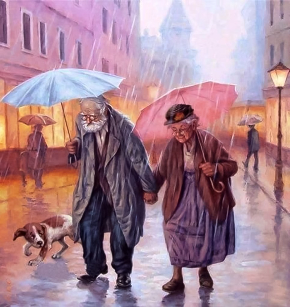 Y no olvidar a aquellos, en los cuales decenios de pertinentes lluvias han dado lugar a un andar cadencioso a pequeños pasos, con las espaldas encorvadas por el peso de los muchos años, pero siempre unidos bajo la lluvia, porque los amores de mayo son eternos, y el primer beso bajo la lluvia nunca se olvida.