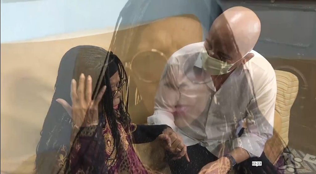 En esta imagen que capturé de la pantalla y de una toma que dura tan solo fracciones de segundos, es perfectamente visible el Aura de Juana Bacallao, situada en el centro de la pantalla, entre ella y su interlocutor, brindándole protección como la ha hecho durante toda su larga vida.