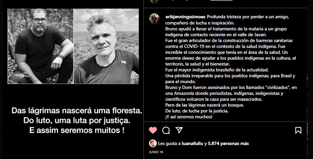 Lo Real Maravilloso cita las palabras de duelo del neurocirujano, indigenista y defensor de la etnia Zo’é; Erik Jennings: “Profunda tristeza por perder dos amigos, compañeros de lucha e inspiración. De lágrimas de luto, nacerá un bosque, de lucha por la justicia. ¡Así seremos muchos!