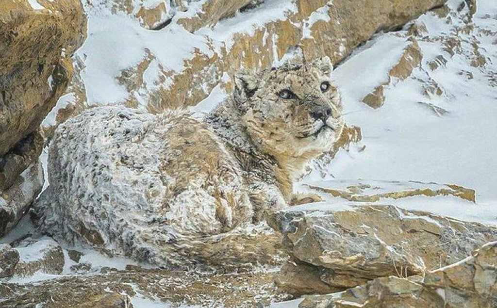 La imagen incluye un leopardo de las nieves que está escondido en la intrincada orografía de un pico helado del Himalaya, oculto casi por completo entre las piedras y cubierto de nieve. Todo un artista del camuflaje y el sigilo.