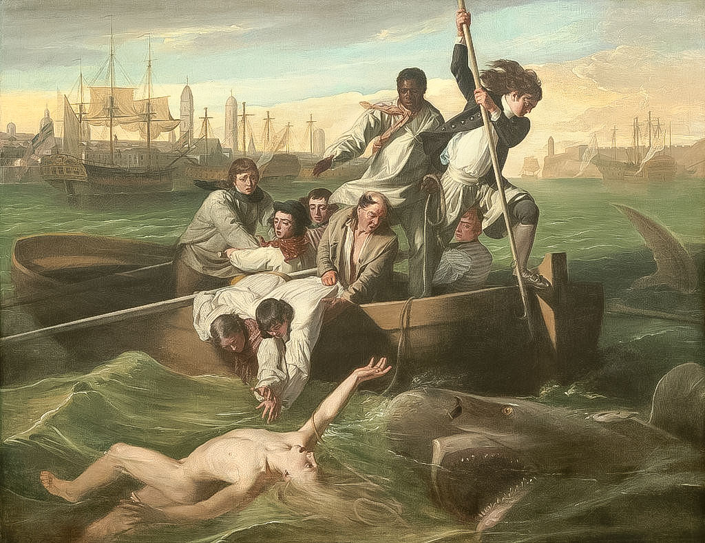 En 1778, un notable pintor estadounidense radicado en el Reino Unido, John Singleton Copley, se hizo famoso con su cuadro “Watson y el tiburón”, pieza que muestra una tragedia marítima basada en el relato de un sobreviviente.