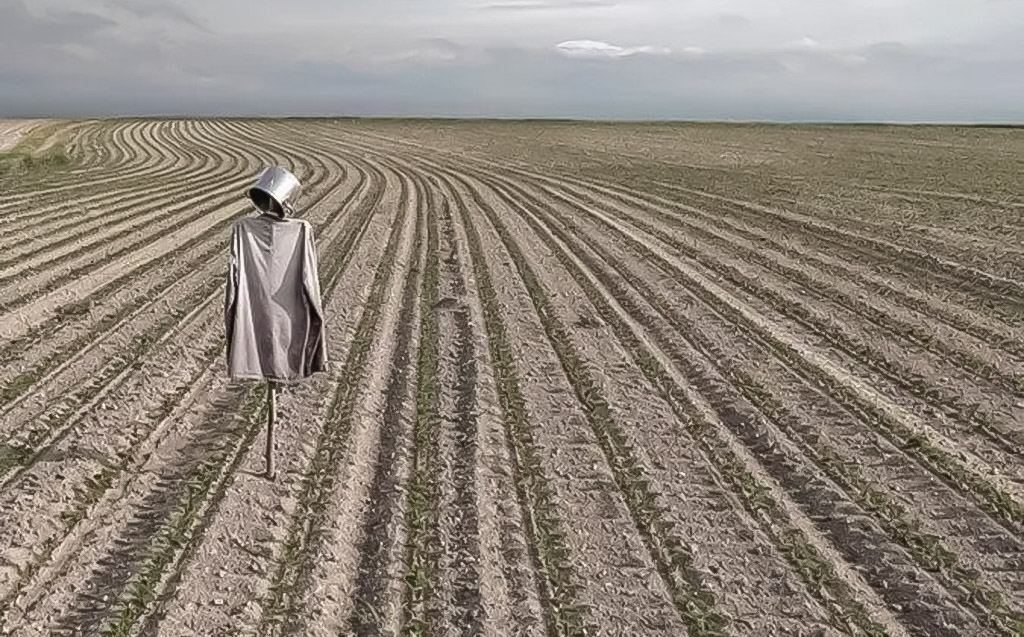 Una enorme extensión de terreno potencialmente cultivable, que en años pasados fue rica en cultivos y frutos, y necesito de espantapájaros para espantar las aves y proteger las cosecha, es hoy, un extenso yermo en espera de la lluvia, con un fantasma de mal agüero colgado en cruz, en espera de la vida que no llega.