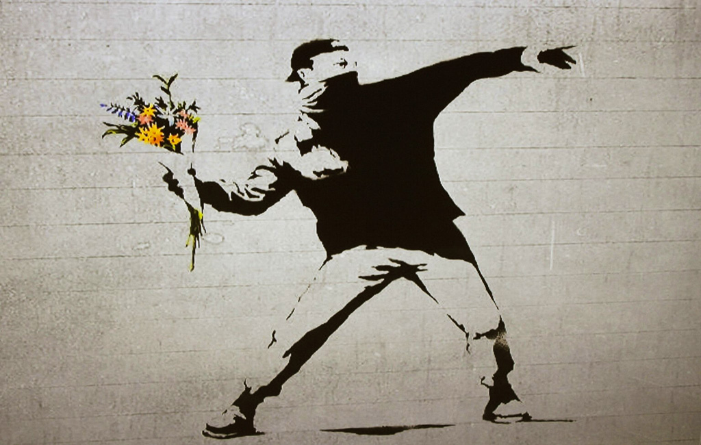 «El lanzador de flores» o «Love is in the air» es una de las obras más conocidas del artista callejero Bansky, apodo por el que se conoce al artista del grafiti más reconocido de los últimos tiempos. Sobre él, se sabe poco o nada. Solo se da a conocer a través de sus obras cargadas de críticas ácidas a los gobernantes o por sus mensajes políticamente subversivos que transmite a través de sus esténciles (grafitis hechos con plantillas).