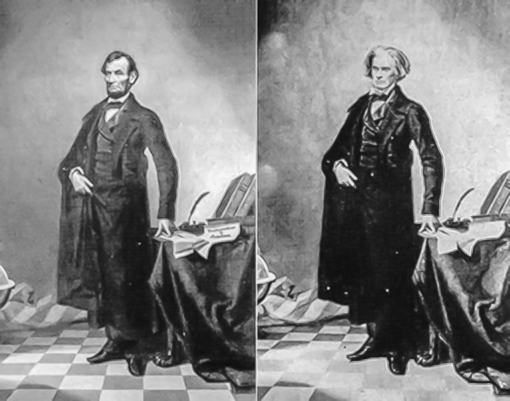 Este retrato del presidente estadounidense Abraham Lincoln es en realidad una composición. Sobre un retrato del político sureño John Calhoun, se insertó la cabeza de Lincoln. El mensaje del plagio, tiene mucha tela por donde cortar porque Calhoun era el líder de la facción esclavistas en el senado entre 1830 y 1840. Más allá de las consideraciones técnicas y artísticas que pudieron llevar al uso de Calhoun como plantilla de la fotografía falsa, su objetivo político era resaltar la victoria de Abraham Lincoln sobre el sur secesionista.