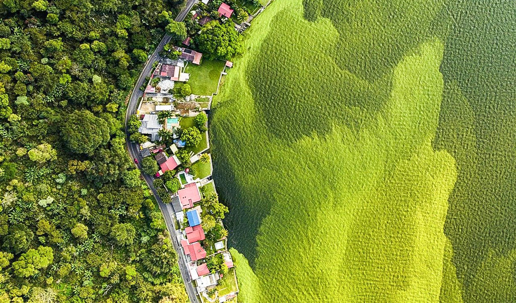 El fotógrafo Daniel Núñez utilizó un dron para capturar el contraste entre el bosque y el crecimiento de las algas en el lago de Amatitlán. Captó la imagen desde el aire y la nominó “El lago Moribundo”, para crear conciencia sobre el impacto de la contaminación en el lago, el cual recibe alrededor de 75.000 toneladas de desechos de la vecina Ciudad de Guatemala cada año. «Fue un día soleado con condiciones perfectas», dice, «pero se trata de un momento triste e impactante para la naturaleza».