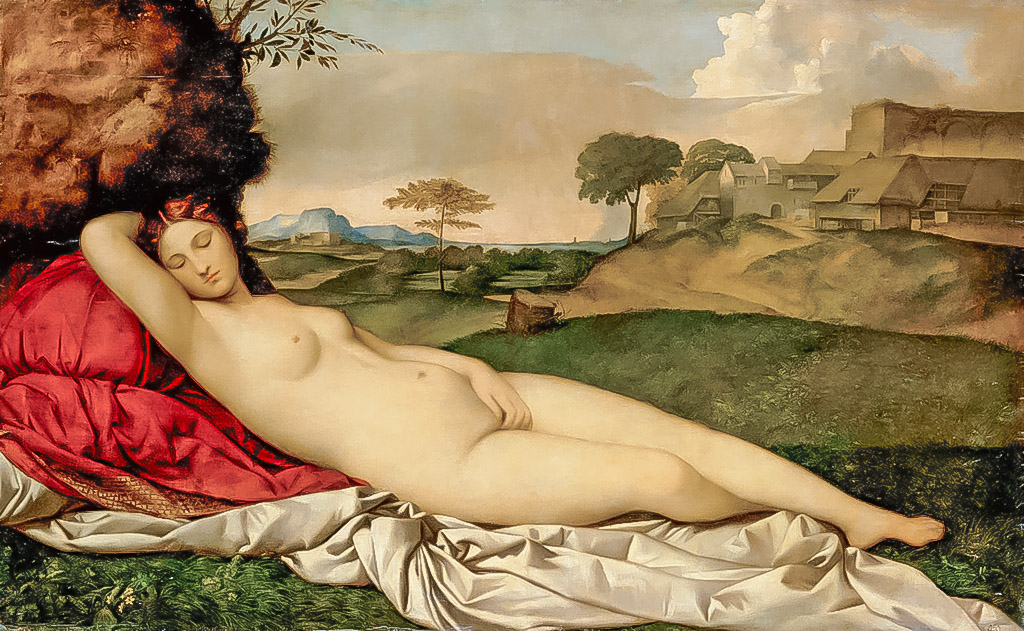 “La Venus dormida” o “Venus de Dresde” es una pintura al óleo sobre lienzo realizada hacia 1510, por el artista italiano del Renacimiento Giorgio Barbarelli, conocido comoGiorgione. Es una de las primeras representaciones, a gran escala en el arte veneciano, de una mujer desnuda tendida, y ejerció una gran influencia en otros pintores como Tiziano y Rubens. La obra muestra a la diosa Venus durmiendo en un paisaje bucólico, con gran armonía entre figura y fondo. El cuadro tiene un carácter erótico, expresado por la postura de la mano izquierda de la diosa sobre su pubis y el hueco de su axila derecha. Sin embargo, también hay una distancia y una contemplación de la belleza y la naturaleza, que se refleja en los tonos plateados y fríos del paisaje y la actitud recatada de la durmiente. La obra quedó inconclusa por la muerte de Giorgione a causa de la peste, y el cielo fue terminado por Tiziano. La pintura fue propiedad de la Casa de Este y luego de la Casa de Sajonia, y actualmente se conserva en la Gemäldegalerie Alte Meister de Dresde, Alemania.