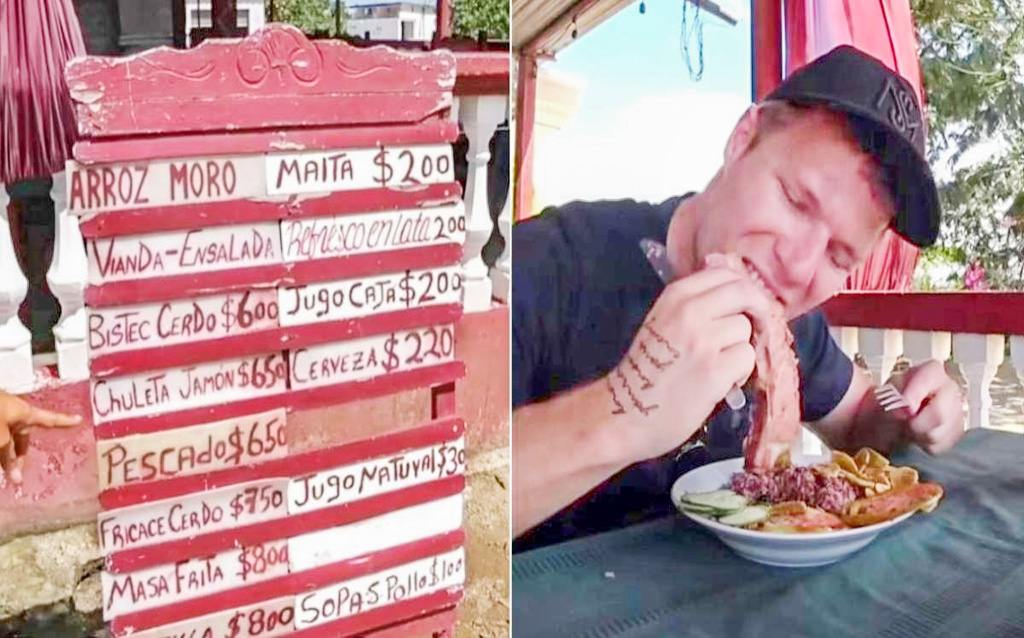 Un video compartido en Facebook muestra la amplia oferta de comida y el trato familiar que recibió en el local, donde quedó encantado con una chuleta de jamón de cerdo acompañada de arroz congrí y plátano frito que comió por 650 pesos. De postre: flan; y de bebida: una cola importada de España.