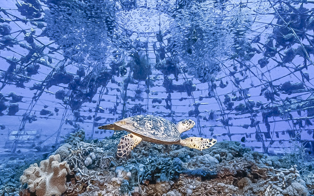 La fotografía muestra una tortuga carey observando un vivero de coral cerca del Mar Rojo. Ganadora en la categoría “Poner el océano primero”.