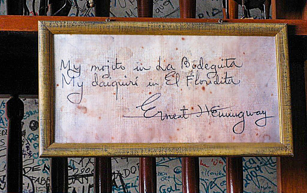 Dicen que Hemingway solo acudió una vez al establecimiento, pero su corta visita fue muy provechosa porque le regaló una frase, escrita en un pergamino de papel rústico, que contribuiría a aumentar la fama internacional del ya visitado restaurante: «Mi daiquiri en El Floridita y mi mojito en La Bodeguita».