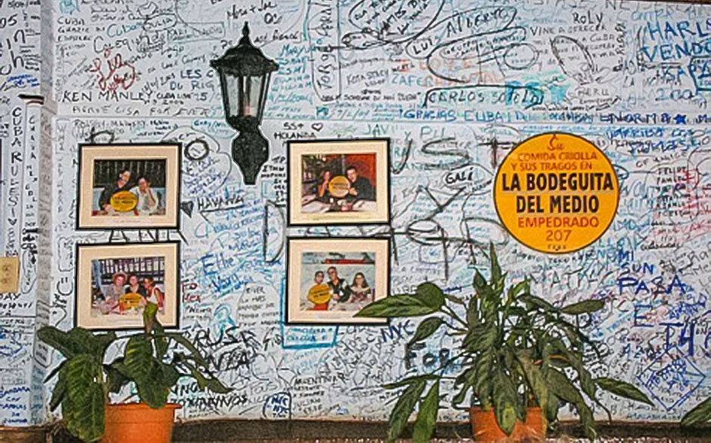 La lista de ilustres visitantes, han hecho de la internacionalmente conocida Bodeguita, uno de los lugares mágicos más afamado, del mundo Real Maravilloso americano. Por sus mesas de madera y taburetes de cuero han desfilado durante decenios lo más alto de la farándula de famosos del arte, las letras, la política y los deportes, y todos ellos han dejado estampada sus impresiones y firmas, en los grafitis de sus paredes.