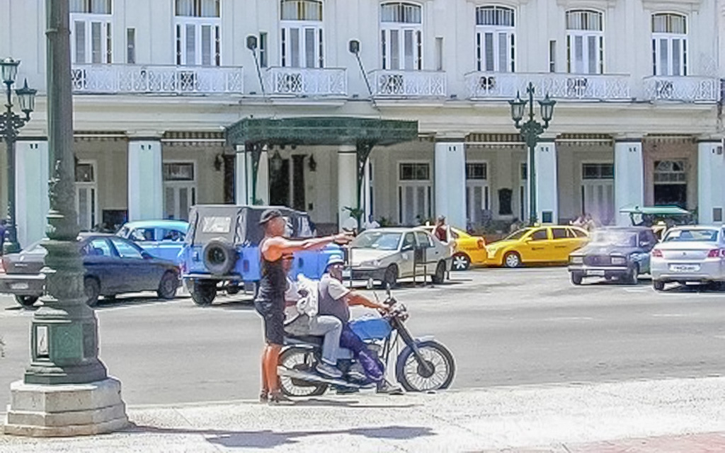 Fachada del Hotel Inglaterra, comprendida dentro de La Acera del Louvre, lugar histórico en La Habana Vieja. Obsérvese la multiplicidad y originalidad de los medios de transportes estacionados en el parqueo.