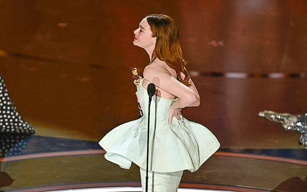 Emma Stone, mientras subía al escenario, sintió que algo no andaba bien con su vestido: se había roto en la parte de atrás. Sus colegas actrices intentaron ayudarla, pero finalmente la actriz de 35 años decidió dejarlo así: “Esto no es sobre mí, esto es sobre el trabajo en equipo que hizo que todas las partes sumaran a un gran trabajo”, dijo la actriz bastante emocionada. Pero antes de retirarse del escenario, le hizo un pedido al público: “Por favor no miren mi vestido por detrás”.
