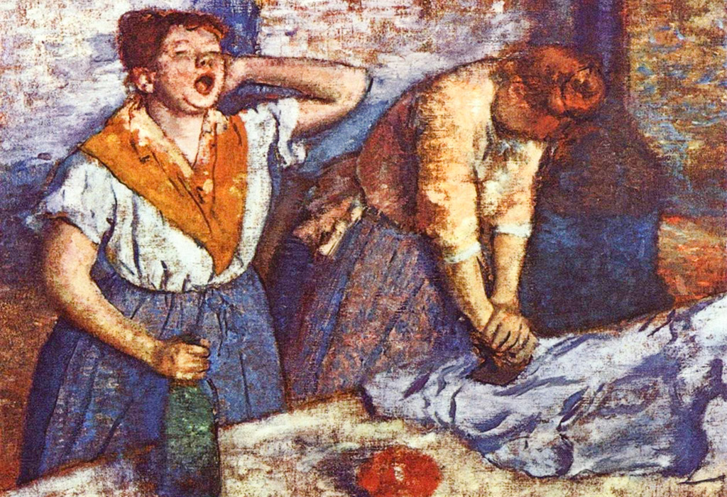 Al igual que las mujeres en el baño y las bailarinas, las planchadoras aparecen insistentemente en la obra de Degas, con varias versiones a lo largo de doce años. La primera, de 1874, fue un encargo de Jean-Baptiste Faure, célebre barítono y coleccionista de arte, que aceptó prestarla a la exposición impresionista de 1876.