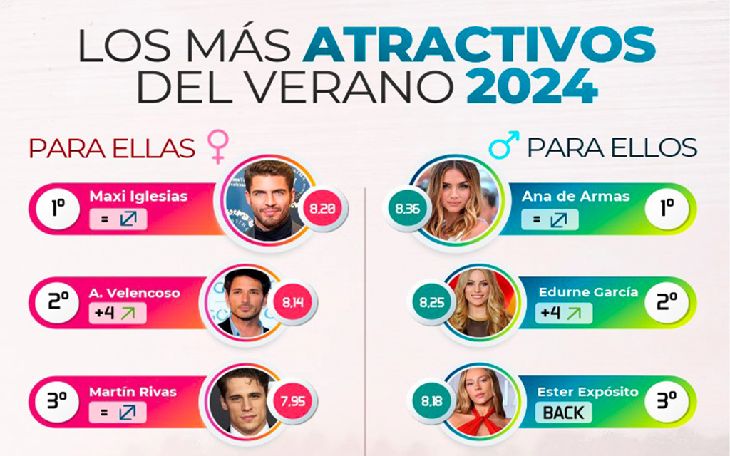 Por segundo año consecutivo, Ana de Armas se corona como la mujer más atractiva para los hombres españoles, con una valoración media de 8,36 sobre 10. Tras ella, se sitúa la cantante y presentadora Edurne (8,25), la actriz Ester Expósito (8,18), Blanca Suárez (8,17) y la cantante Ana Mena (8,15), quien debuta por primera vez en el top 5. El ranking femenino lo completan Elsa Pataky, la única mujer que ha permanecido presente durante las 15 ediciones del estudio, Vanessa Romero, Marta Torné, Kira Miró y Lara Álvarez.
