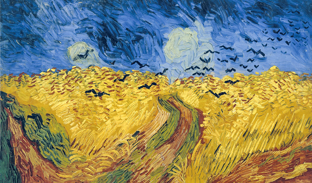 “Campo de trigo con cuervos” representa un cielo dramático y nublado, lleno de cuervos sobre un campo de trigo. La sensación de aislamiento se ve reforzada por un camino central que conduce a ninguna parte y por la dirección incierta del vuelo de los cuervos. El viento barre el trigal que llena dos tercios del lienzo.