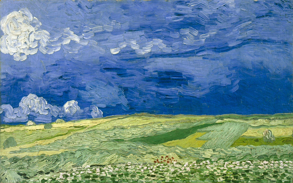 ​Las amplias vistas panorámicas eran habituales en las obras de Van Gogh ejecutadas en sus últimos meses, quizá relacionadas con la angustia vital que padecía. En “Campo de trigo bajo nubes de tormenta” se interesa en el cielo para mostrarnos el efecto de una incipiente tormenta sobre el trigal, donde aún podemos observar, escasas luces del sol veraniego. El juego de colores fríos resulta impactante, emplea el color y abandona las formas, clara influencia de Monet. Las pinceladas ágiles y empastadas dominan la composición, apreciándose la textura del óleo en la tela. A través del color, Vincent expresa sus sentimientos y ánimos, convertidos en un torbellino sentimental de su mundo interior.