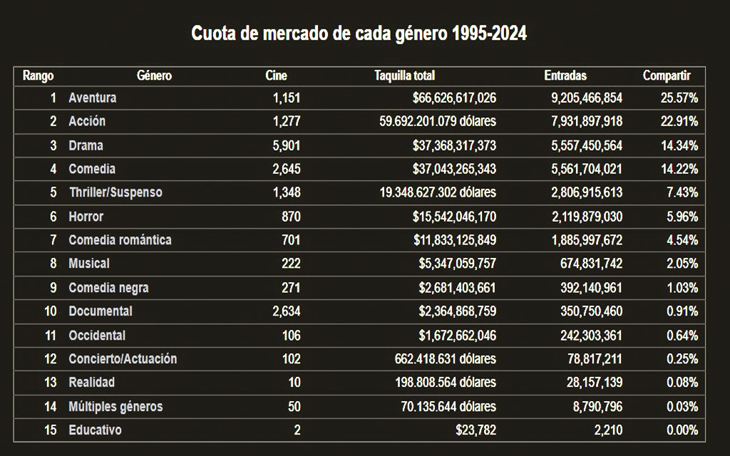 – Horror: Con un 5.96%, el horror ha visto un aumento en popularidad debido a su bajo costo de producción y alto rendimiento en taquilla.