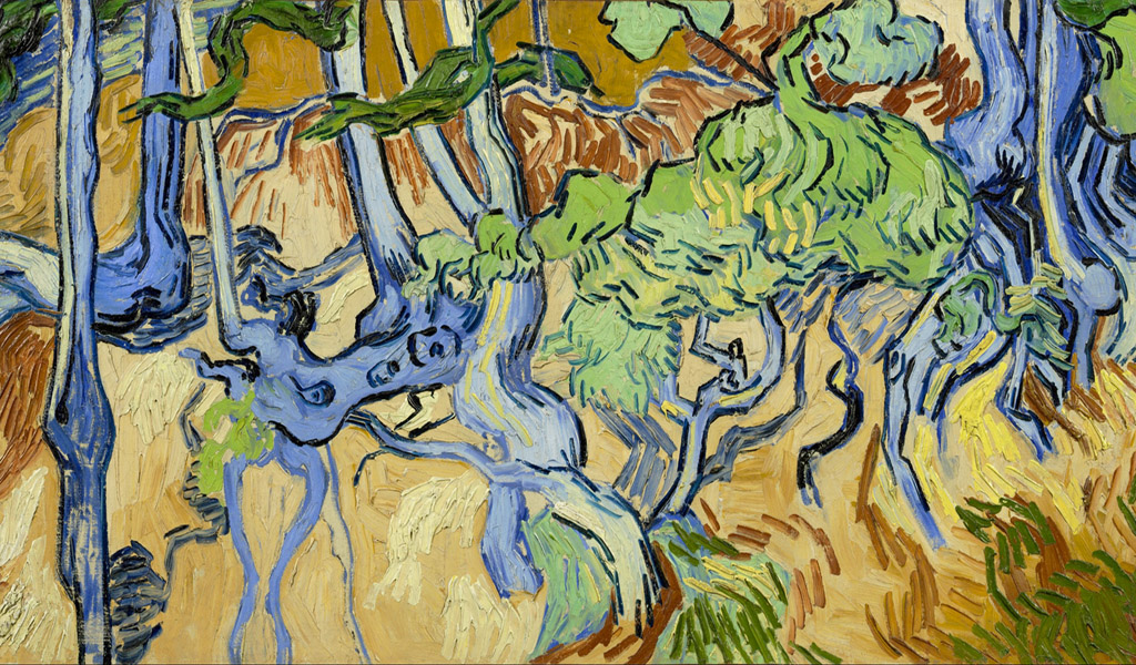 Al acercarnos a la pintura, observamos abundantes raíces de árboles que emergen de forma majestuosa, extendiéndose por todo el lienzo sin un fin aparente, representadas con las increíbles pinceladas enérgicas y orgánicas, propias de Vincent.