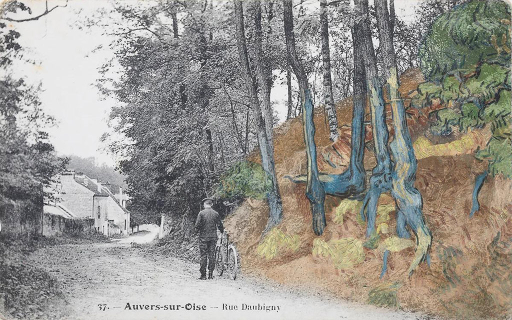 Van der Veen declaró que llegó al hallazgo mientras observaba por azar antiguas fotografías de Auvers fechadas alrededor de 1905, que le había prestado Janine Demuriez, una mujer francesa de 94 años que ha coleccionado cientos de postales históricas. Una de ellas muestra a un ciclista en la Rue Daubigny, de pie, junto a un terraplén empinado, donde las raíces de los árboles son claramente visibles.