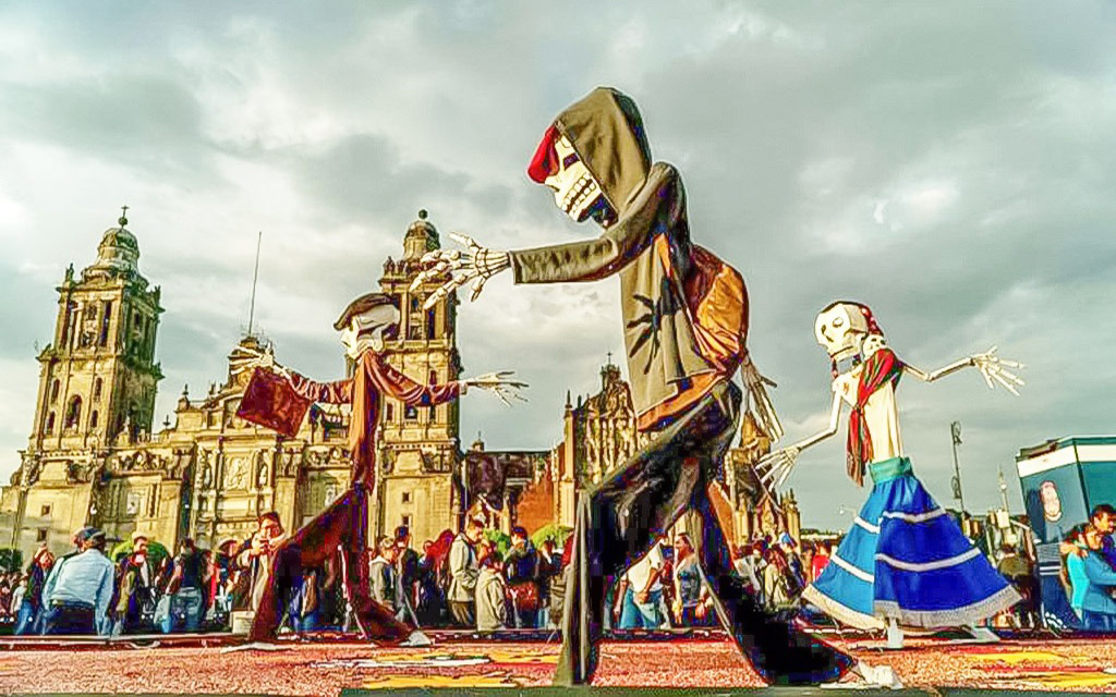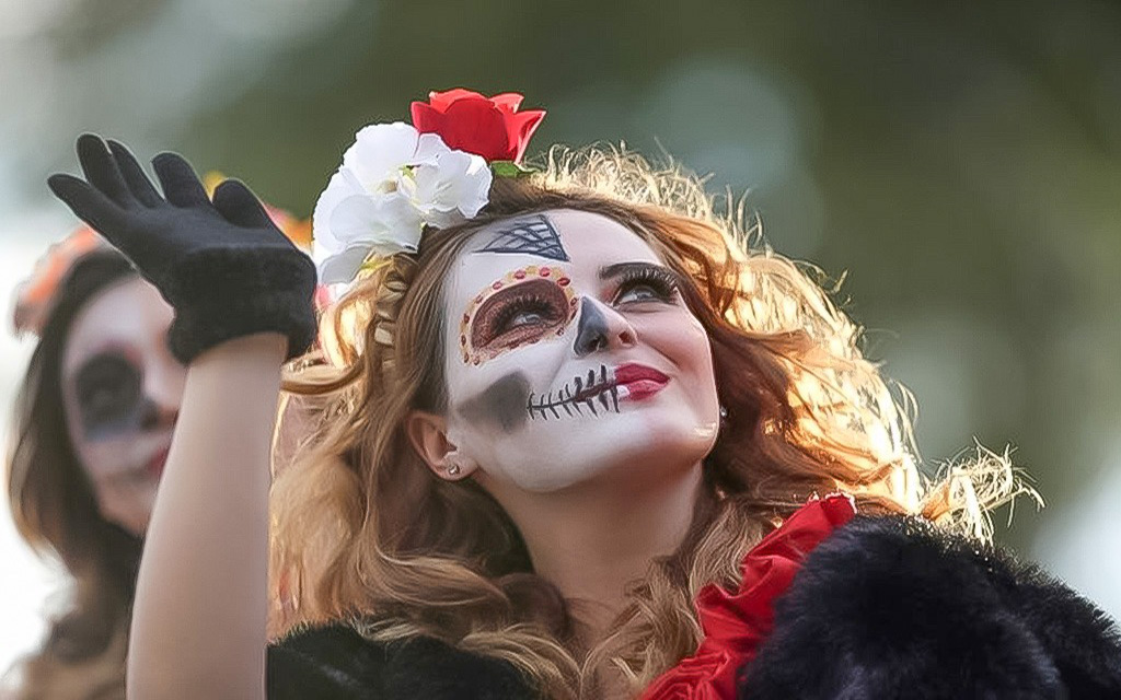 Desfile por el Día de Todos los Santos en México, suceso común en plazas y parques durante la celebración.