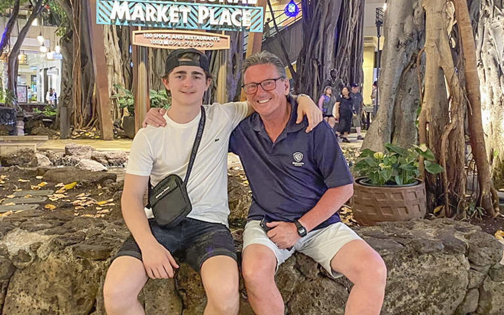 En esta fotografiá de octubre de 2023, proporcionada por la familia Holdsworth, Wayne Holdsworth sonríe junto a su hijo Mac. Holdsworth se convirtió en defensor de prohibir que los australianos menores de 16 años tengan acceso a las redes sociales debido a que su hijo se quitó la vida tras ser víctima de una extorsión sexual en línea.