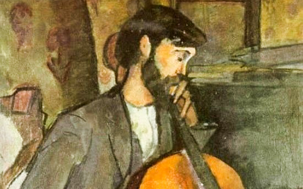 «El violinista» (detalle, 1919): La música fue una fuente de inspiración constante para Modigliani, y en esta obra rinde homenaje a su fascinación por los músicos. Con figuras estilizadas y una paleta de colores cálidos, el artista logra transmitir la armonía y el ritmo que tanto admiraba en el mundo de la música.
