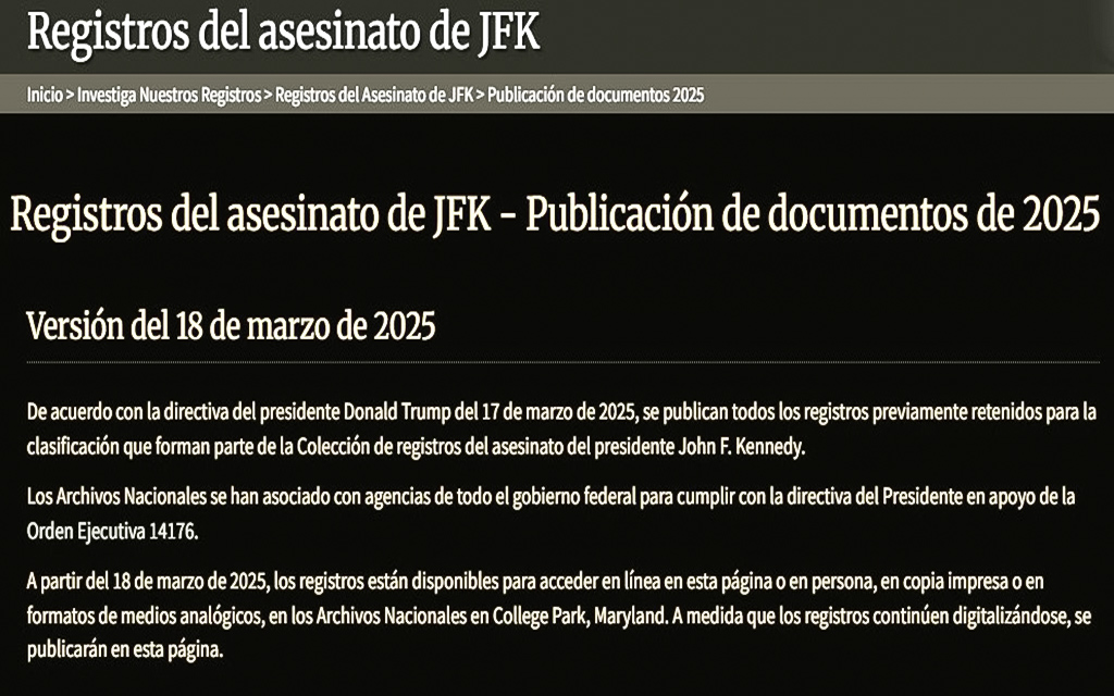 * [Gobierno de EE. UU. hace públicos documentos confidenciales sobre el asesinato de JFK. Fuente: Los Angeles Times.](https://www.latimes.com/espanol/eeuu/articulo/2025-03-18/gobierno-de-eeuu-hace-publicos-documentos-confidenciales-sobre-el-asesinato-de-jfk)