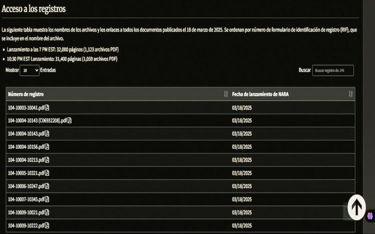 La Administración Nacional de Archivos y Registros (NARA) puso a disposición del público aproximadamente 63,400 páginas de documentos previamente retenidos en sus instalaciones de College Park, Maryland.