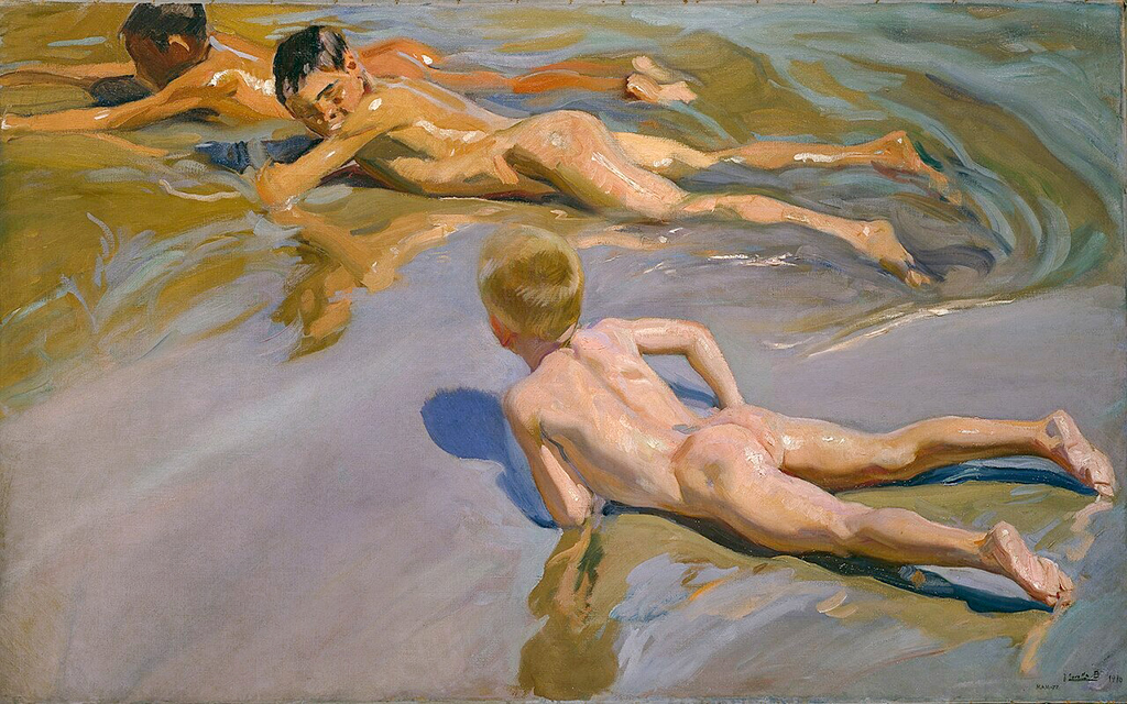 El Mediterráneo de Sorolla nos devuelve la inocencia primera: un niño desnudo, entregado al juego, se convierte en símbolo de la vida que brota entre espuma y arena. La pintura se abre como un espejo de luz, donde el mar no es solo paisaje, sino abrazo, caricia, memoria.