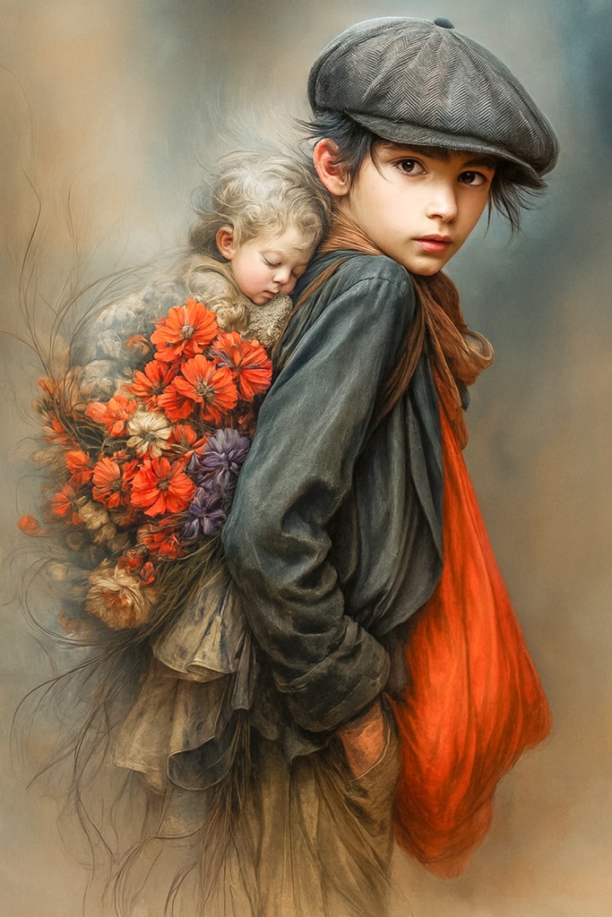 Un niño avanza con la espalda erguida y el gesto grave, como quien sabe que lo que carga no admite descuido. No lleva peso, lleva amor. En su regazo, otro pequeño duerme protegido por un ramo imposible: flores que no brotaron de la tierra, sino del alma. No adornan; abrigan. No distraen; sostienen.