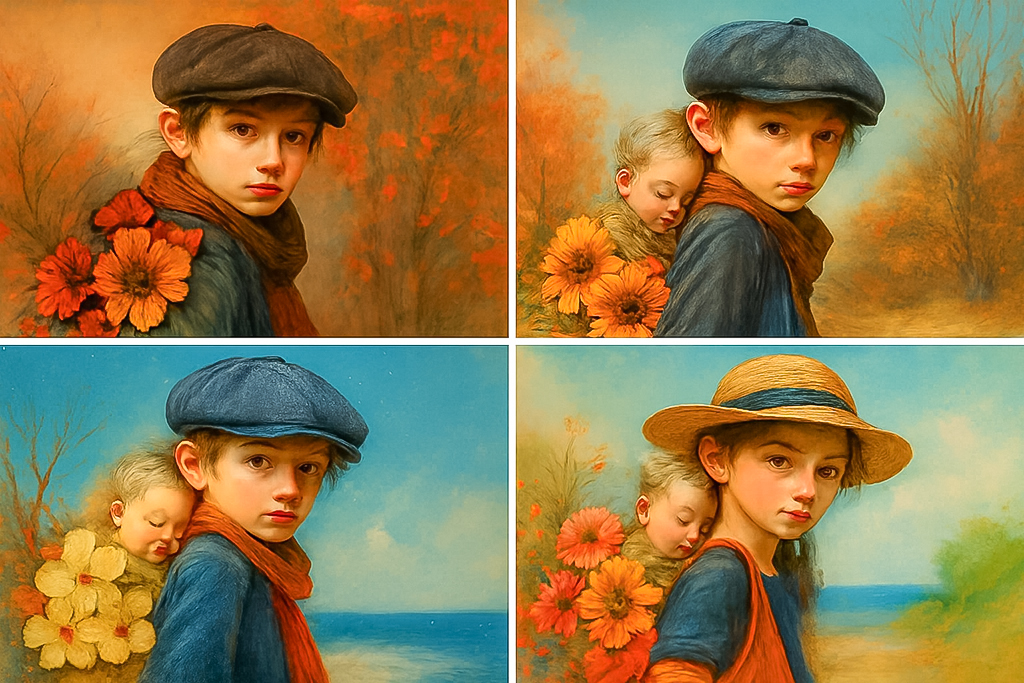 Hay imágenes que no solo conmueven: narran. Este collage de cuatro retratos digitales, nítido y vibrante, nos cuenta la historia de un niño y una niña que se han convertido, desde su nacimiento artificial, en los protagonistas de nuestro atlas digital. Ellos cargan en su espalda a una criatura dormida —su hermana, su reflejo, su promesa— mientras el mundo cambia a su alrededor.