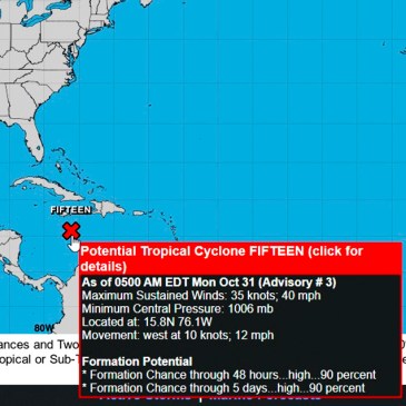La historia se repite, una vez más despertamos bajo amenazas, al sur del oriente cubano se ha formado la depresión número 15 de la actual temporada ciclónica y su posibilidad de transformarse en un terrible ciclón tropical es del 90% en 48 horas, plazo que se extiende a 5 días. Depresión tropical número 15 de … More La historia de nunca acabar.